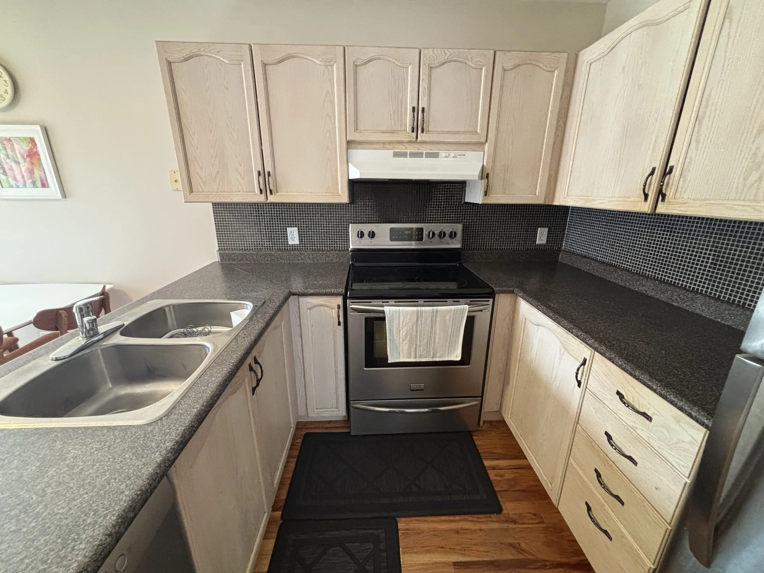 Modern, eat-in kitchen with patio walkout to back deck, includes fridge, stove and dishwasher